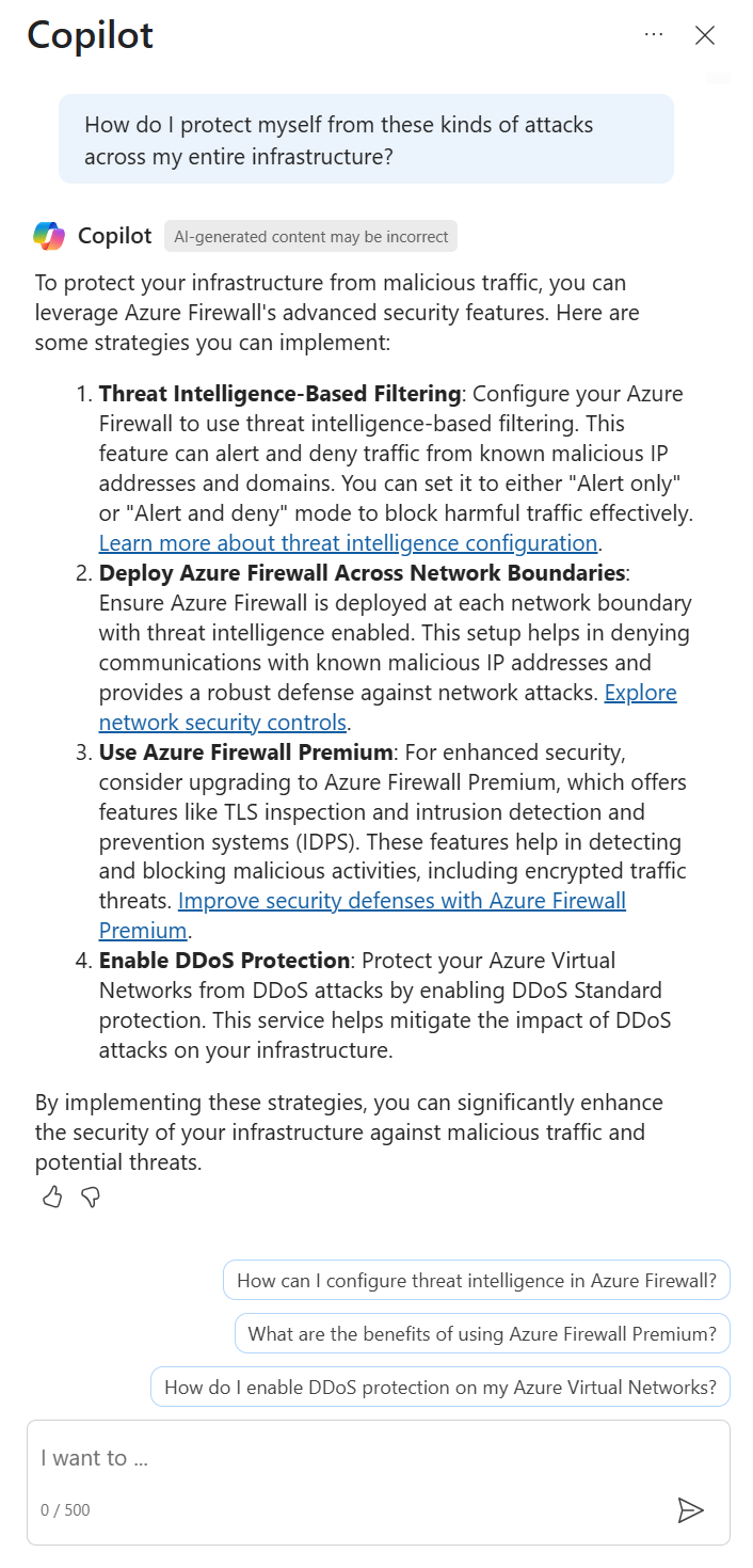 Security Copilot también puede usar la funcionalidad Preguntar documentación de Microsoft para proporcionar esta información y al usar esta funcionalidad a través de la experiencia de Azure Copilot, se puede usar la funcionalidad Obtener información para proporcionar esta información.
