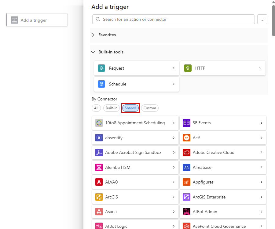 Captura de pantalla que muestra el diseñador de flujo de trabajo en blanco y el panel denominado Agregar un desencadenador. En la sección Por conector, se selecciona la opción Compartido.
