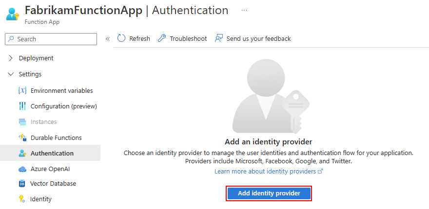 En la barra lateral de la aplicación de funciones, en Configuración, seleccione Autenticación y, a continuación, seleccione Agregar proveedor de identidades, por ejemplo: