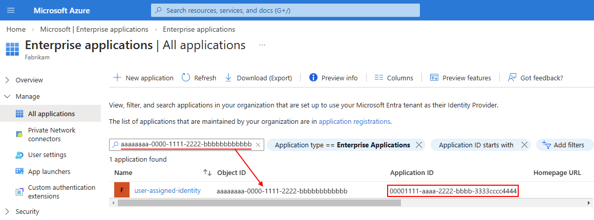 En la página Todas las aplicaciones, en el cuadro de búsqueda, escriba el identificador de objeto de la identidad administrada. En los resultados, busque la aplicación empresarial que coincida y copie el Id. de la aplicación:
