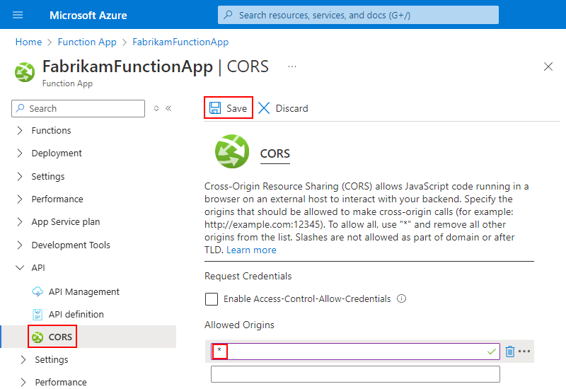 En la aplicación de función, siga estos pasos para configurar el uso compartido de recursos entre orígenes (CORS) de manera que se permitan todos los orígenes: