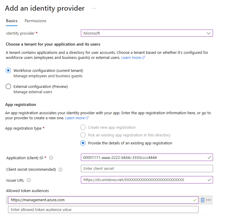 Parámetro Obligatorio Valor Descripción Id. de la aplicación (cliente) Sí < id. de aplicación> Identificador único que se va a usar para este registro de aplicación. En este ejemplo, use el identificador de aplicación que copió para la aplicación Enterprise asociada a la identidad administrada. Dirección URL del emisor No < authentication-endpoint-URL>/<Microsoft-Entra-tenant-ID>/v2.0 Esta dirección URL redirige a los usuarios al inquilino de Microsoft Entra correcto y descarga los metadatos adecuados para determinar las claves de firma de tokens y el valor de notificación del emisor del token correspondientes. Para las aplicaciones que usan Azure AD v1, omita /v2.0 en la dirección URL.