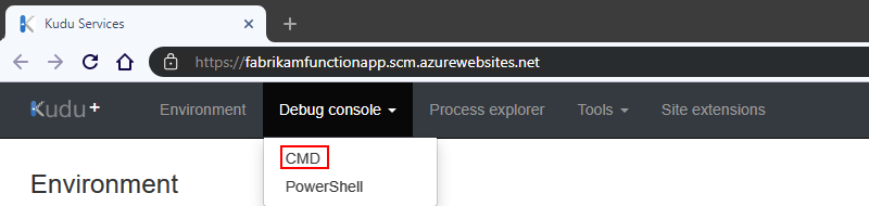 Una vez que se abra la página Kudu Services, en la barra de título del sitio web de Kudu, en el menú Consola de depuración, seleccione CMD.