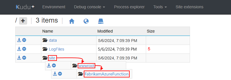 En la página siguiente, en la lista de carpetas, seleccione sitio>wwwroot>your-function.