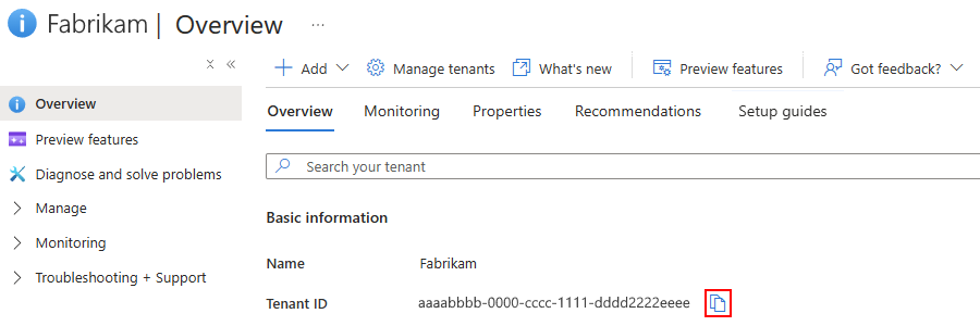 En esta guía se usa fabrikam como inquilino de ejemplo.