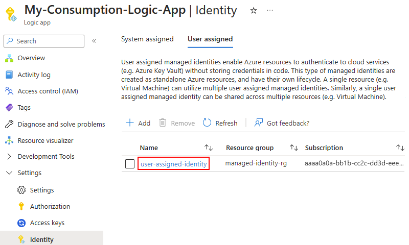 El flujo de trabajo de Consumo puede usar una identidad administrada asignada por el usuario creada manualmente para autenticar la llamada a la función de Azure y acceder a los recursos protegidos por Microsoft Entra ID. Una identidad administrada autentica el acceso sin necesidad de iniciar sesión y proporcionar credenciales o secretos. Azure administra esta identidad automáticamente y ayuda a proteger sus credenciales porque no tiene que administrar credenciales ni rotar secretos.