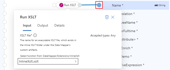 Captura de pantalla que muestra la superficie abierta del asignador de datos y la función Ejecutar XSLT con el archivo InlineXslt.xsd seleccionado.