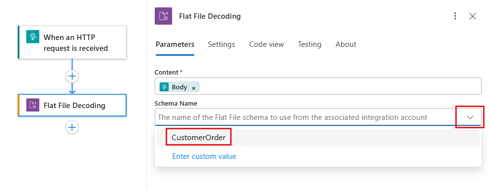 En flujos de trabajo estándar, las operaciones de archivo plano le permiten elegir un esquema de una cuenta de integración vinculada o de uno que haya cargado previamente en su aplicación lógica, pero no ambos al mismo tiempo.
