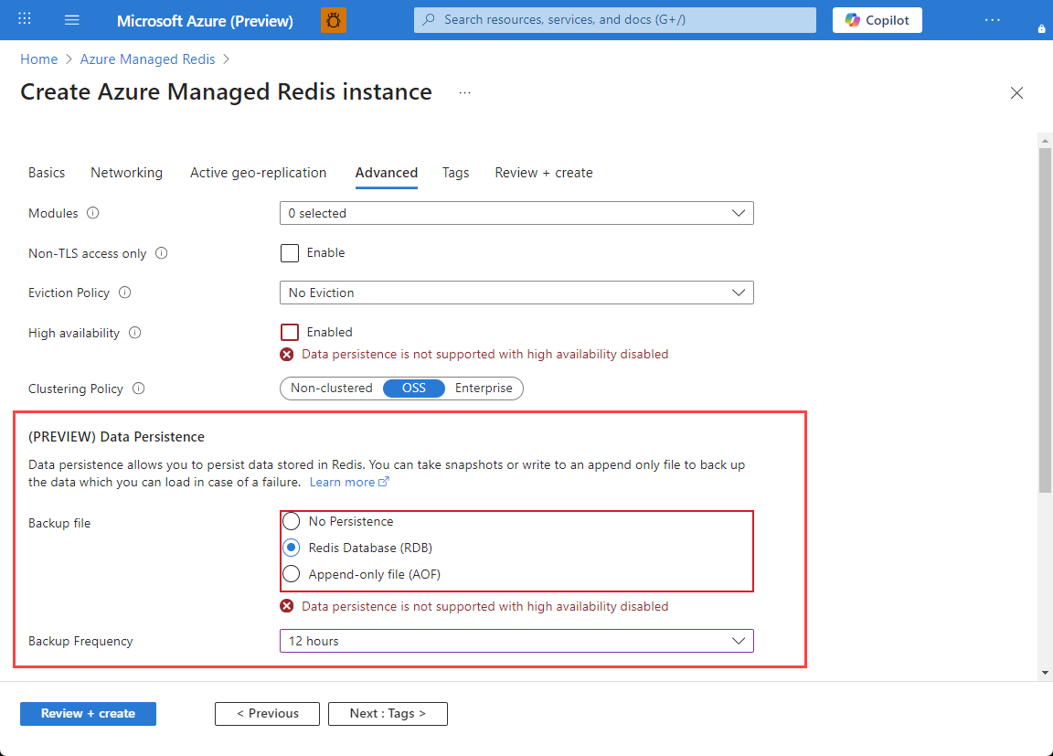 - La persistencia de datos requiere que una memoria caché tenga habilitada la alta disponibilidad . La característica de persistencia de datos no se admite cuando se usa la replicación geográfica activa.