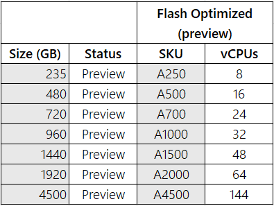 Todos los niveles en memoria que usan más de 235 GB de almacenamiento se encuentran en versión preliminar pública, incluidos los Optimizados para Memoria M350 y superiores; los Equilibrados B350 y superiores; y los Optimizados para Computación X350 y superiores. Todos estos niveles y superiores se encuentran en versión preliminar pública.