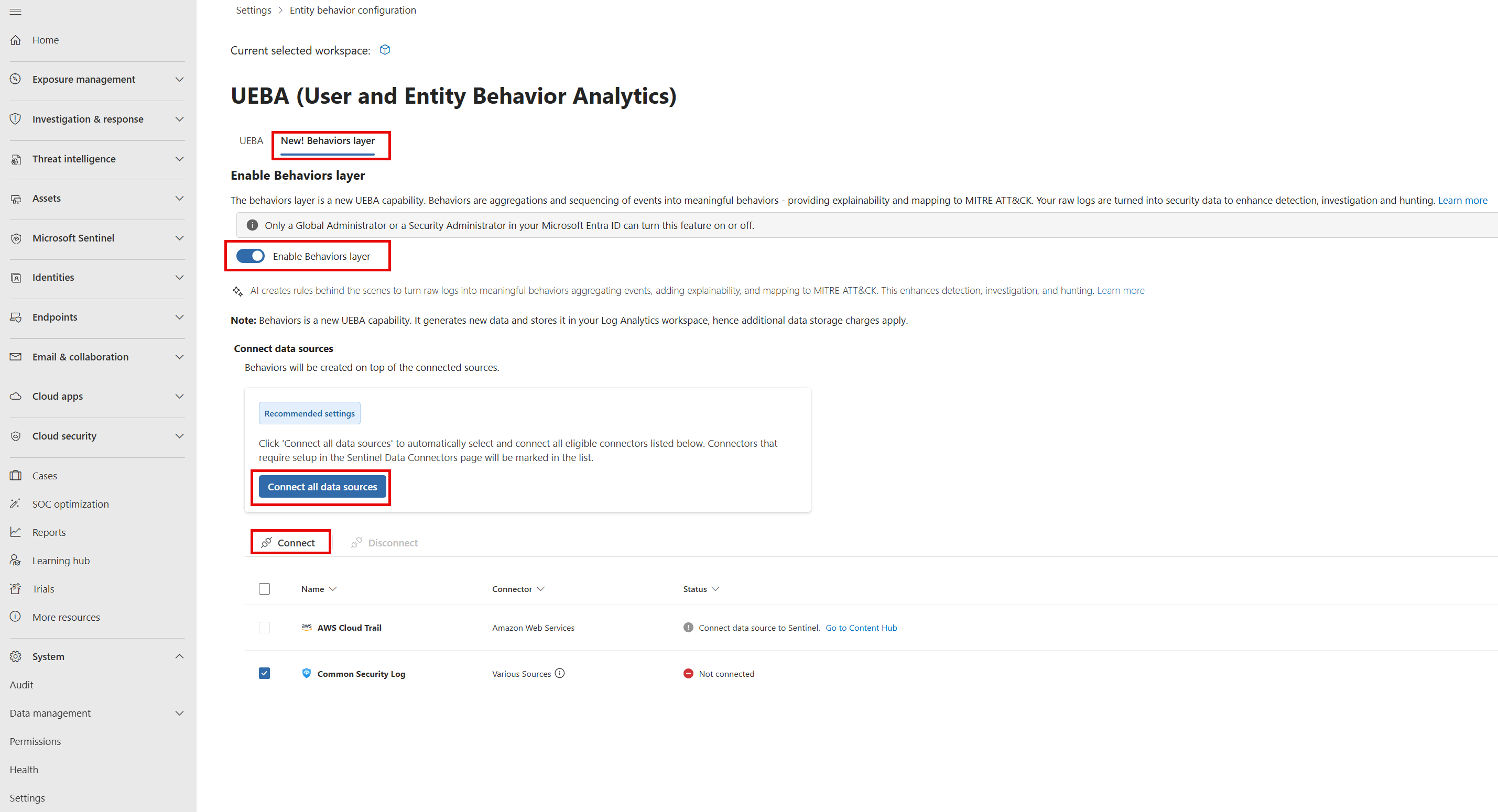 Seleccione el área de trabajo de Sentinel en la que desea habilitar la capa de comportamientos de UEBA.