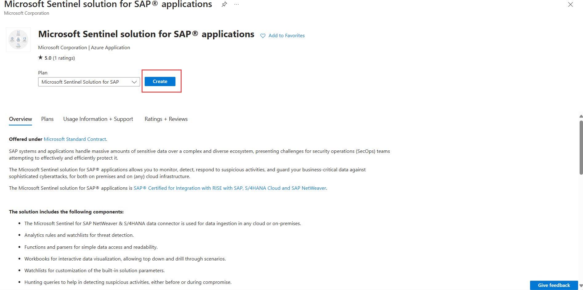 En la página Solución Microsoft Sentinel para aplicaciones de SAP, seleccione Crear para definir la configuración de implementación. Por ejemplo: