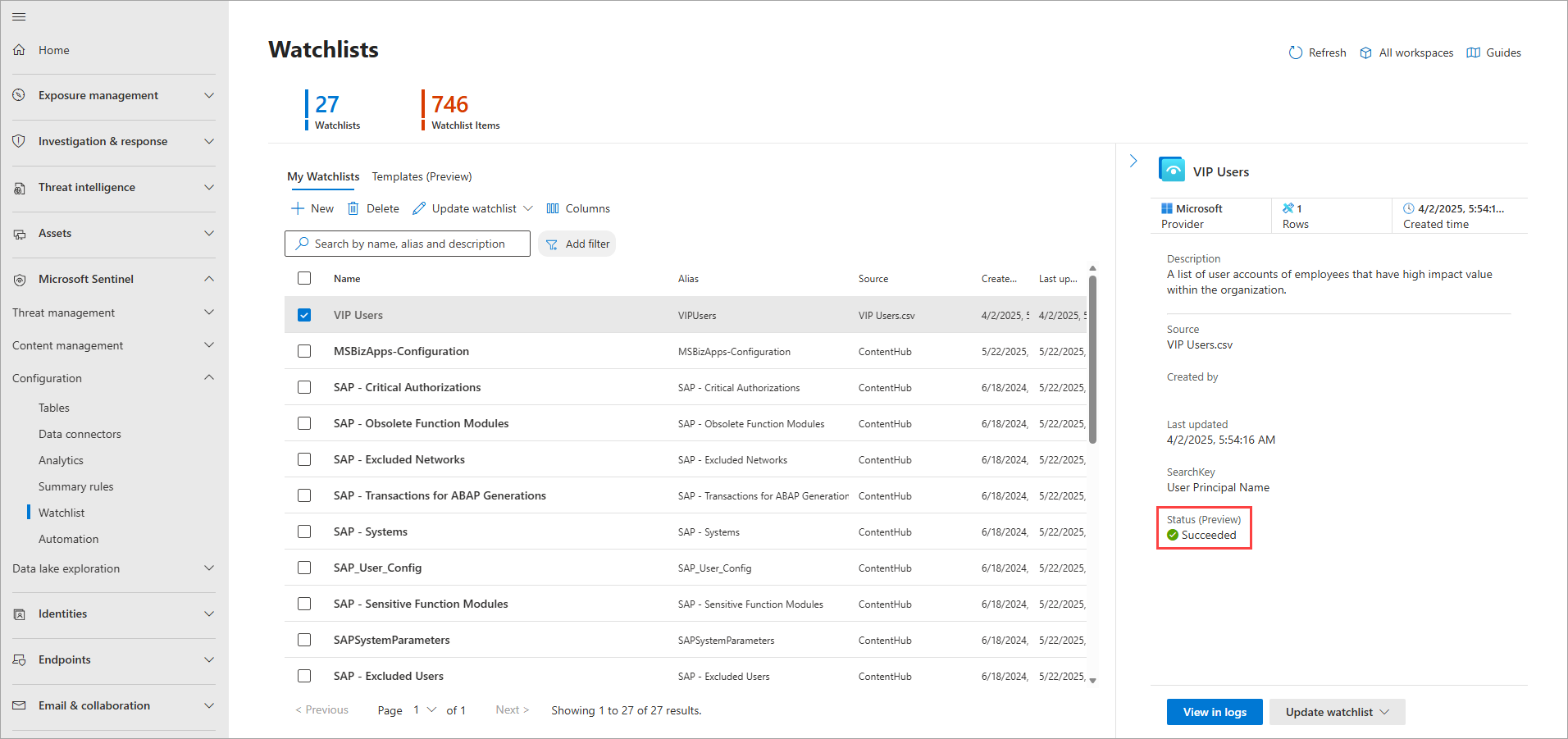 En el portal de Defender, vaya a Microsoft Sentinel>Configuración>Lista de seguimiento.
