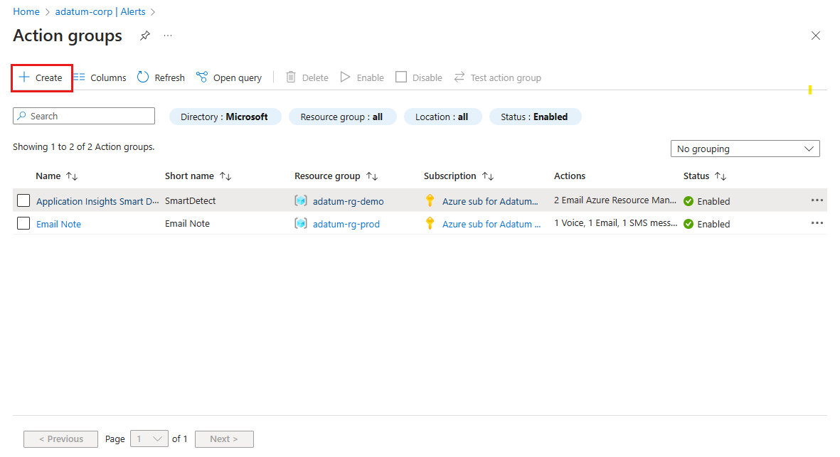 Seleccione Alertas en el panel de navegación y, a continuación, seleccione Grupos de acciones.