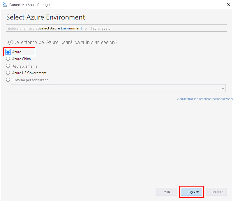 En el panel Seleccionar entorno de Azure, elija un entorno de Azure en el que iniciar sesión. Puede iniciar sesión en Azure global, en una nube nacional o en una instancia de Azure Stack. Luego, seleccione Siguiente.