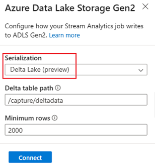 La escritura en la tabla de Delta Lake (versión preliminar) se admite en ADLS Gen2 como salida del editor sin código. Se puede acceder a esta opción en la sección Serialización de la configuración de ADLS Gen2. Para obtener más información sobre esta funcionalidad, consulte Escritura en la tabla de Delta Lake.