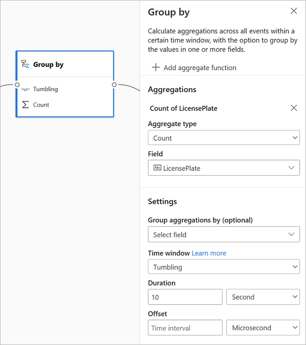 Para agregar otra agregación a la misma transformación, seleccione Agregar función de agregado. Tenga en cuenta que el campo Agrupar por y la función de ventana se aplicarán a todas las agregaciones de la transformación.