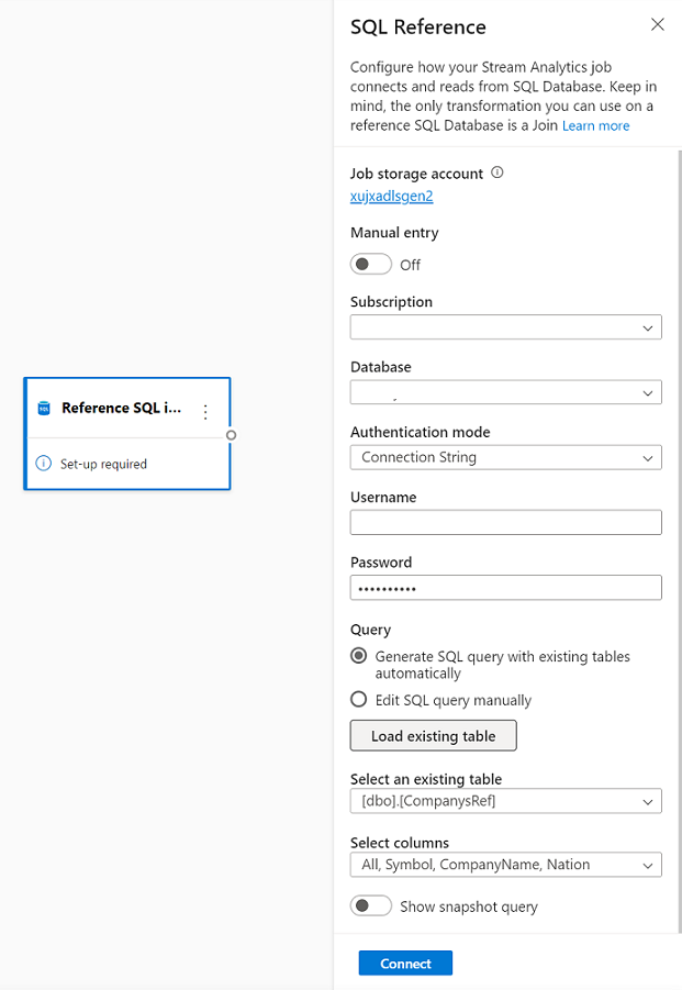 Para configurar SQL Database como entrada de datos de referencia, seleccione Referencia a SQL Database en la sección Entradas de la cinta de opciones. A continuación, rellene la información para conectar la base de datos de referencia y seleccione la tabla con las columnas necesarias. También puede capturar los datos de referencia de la tabla editando manualmente la consulta SQL.