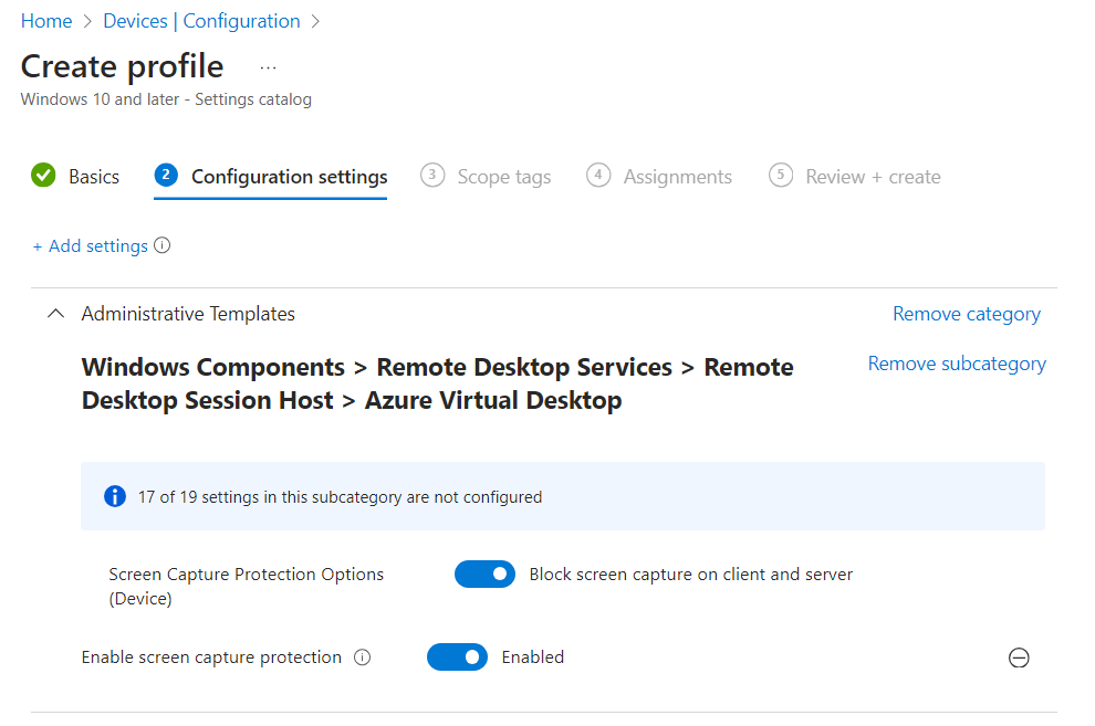 Para configurar la protección de captura de pantalla en hosts de sesión mediante Microsoft Intune: