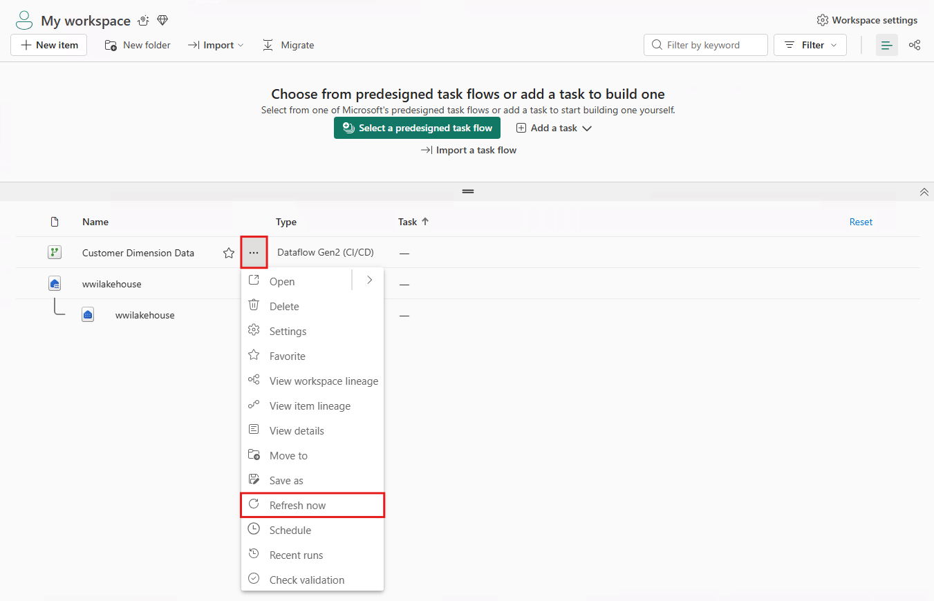 Vuelva al área de trabajo y mantenga el puntero sobre el flujo de datos de dimensión del cliente , seleccione el menú ... y, a continuación, seleccione Actualizar ahora. Esta opción ejecuta el flujo de datos y mueve los datos del archivo de origen a la tabla de lago de datos. Mientras está en curso, verá un círculo giratorio junto al nombre del flujo de datos.