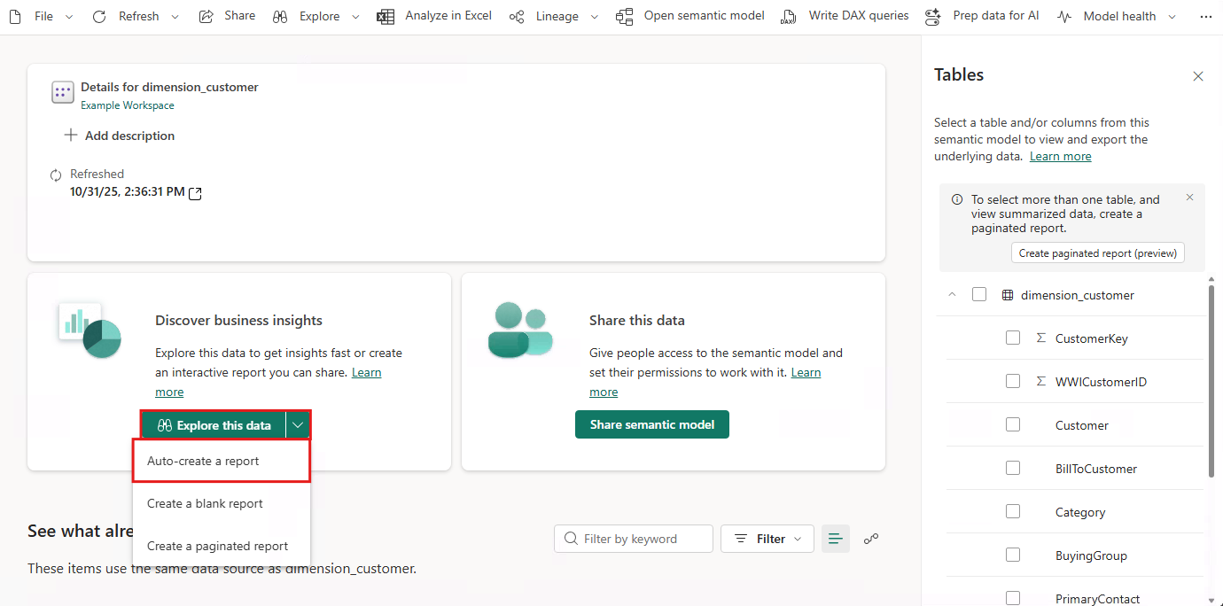 Seleccione el modelo semántico en el área de trabajo, seleccione la lista desplegable Explorar estos datos y, a continuación, seleccione Crear automáticamente un informe. En el siguiente tutorial, se crea un informe desde cero.