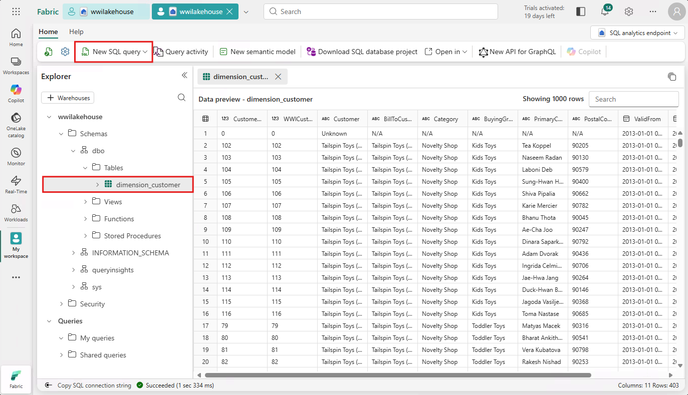 Seleccione la tabla dimension_customer para obtener una vista previa de sus datos o seleccione Nueva consulta SQL para escribir las instrucciones SQL.