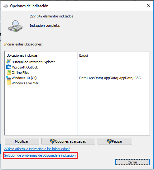Opción 2: Ejecuta el solucionador de problemas de Indización.