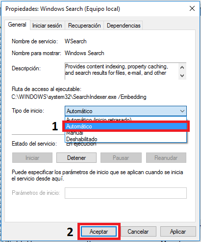 3. En la pestaña General, modifica el valor por Automático de la sección llamada Tipo de inicio. Después, haz clic en el botón Aceptar.