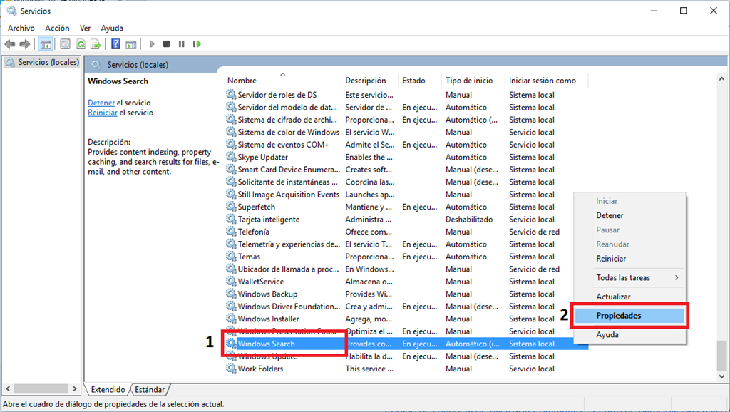 2. Ubica el servicio llamada Windows Search, haz clic derecho y selecciona la opción Propiedades.