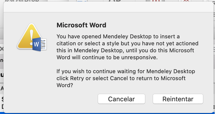 Me gustaría comentarle un problema que llevo teniendo desde hace un tiempo. Es con el programa Mendeley (para citas bibliográficas), lo tengo instalado en mi ordenador y también el plugin para word, pero a la hora de insertar una cita, no me deja y me aparece el siguiente mensaje: