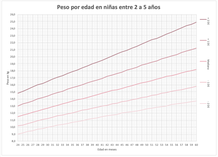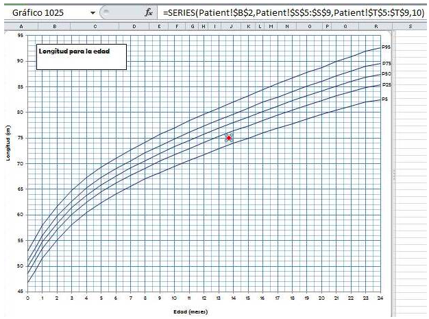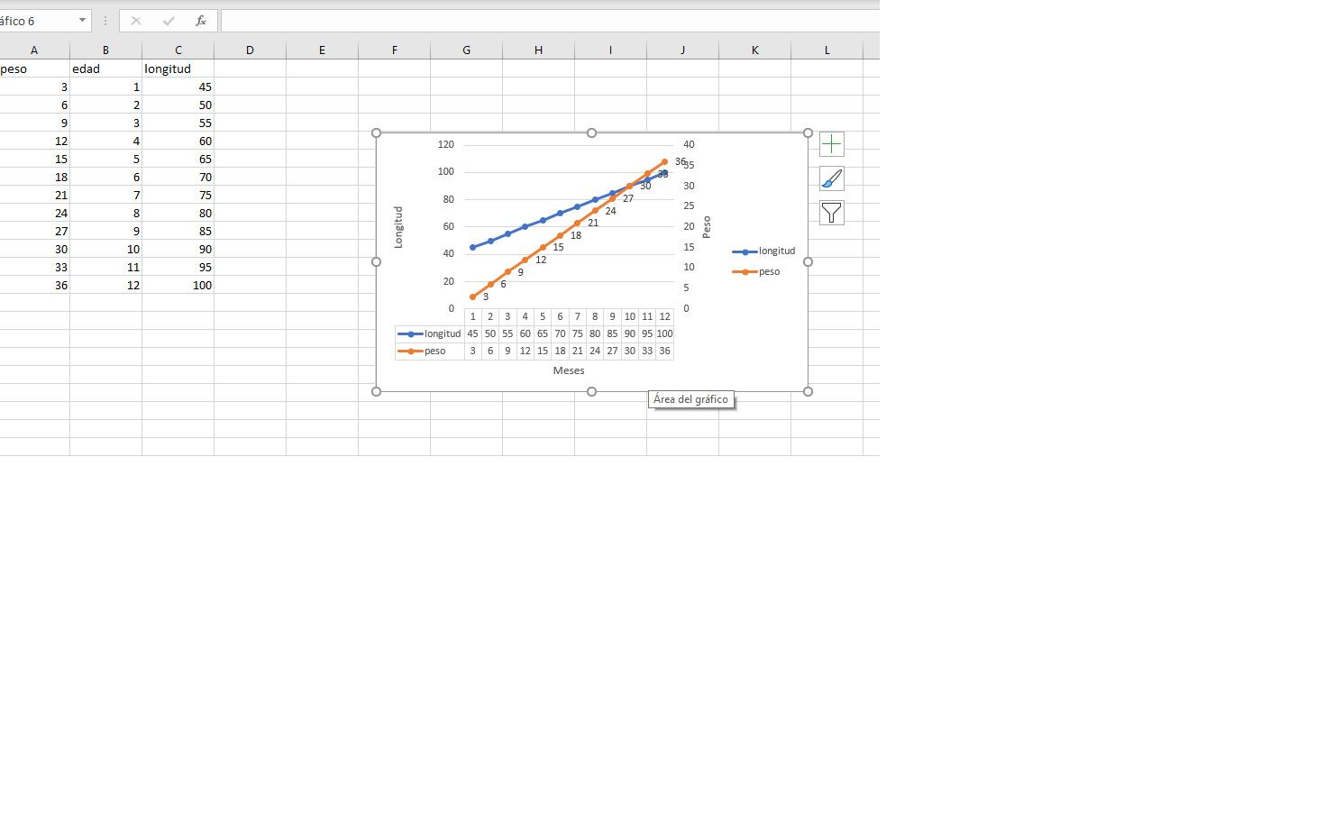 Utiliza en ese caso el siguiente enlace para que pongas un eje secundario ya que tienes 3 valores de datos para graficar (peso, longitud y meses). Puedes guiarte por los siguientes enlaces paso a paso, además te adjunto cómo se vería un gráfico que yo mismo hice de Líneas, estilo líneas con marcadores que lo puedes encontrar en insertar gráficos: