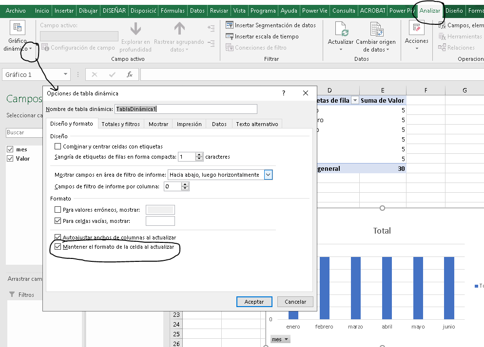 Saludos, tengo un grafico dinamico de barras y la configuracion que viene por diseño no es de mi agrado asi que agrando las letras del grafico y le cambio el color pero al momento de actualizar los datos para que se visualice la nueva informacion pierdo todos esos cambios que hice, como puedo hacer para que perduren despues de actualizar el grafico.