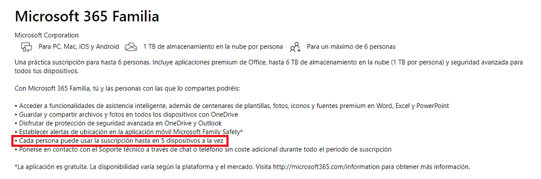 soy Sabina, una asesora independiente. Si tiene una suscripción a Microsoft 365 Familia, puede compartir la suscripción con otras 5 personas (además de usted). Cada persona puede instalar y activar Office hasta 5 dispositivos (PC, Mac, tableta y teléfono inteligente) al mismo tiempo.