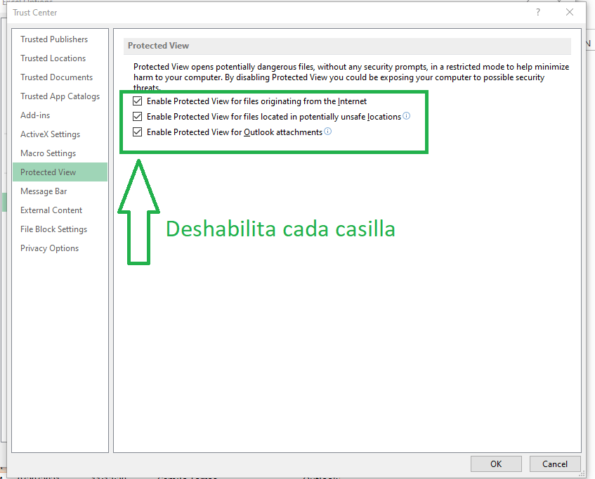 Otra opción a verificar, es revisar las opciones de la Vista protegida: Desde Excel ve a > Archivo > Opciones > Centro de confianza > Configurar el Centro de la confianza > Vista protegida > Deshabilita las 3 opciones que verás: