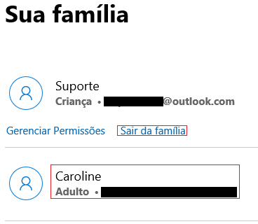 - Haga clic en Salir de la familia o marque el Adulto de la familia que debe aparecer, y solicite ser eliminado siguiendo los pasos de: Elimina miembros de tu familia Microsoft;