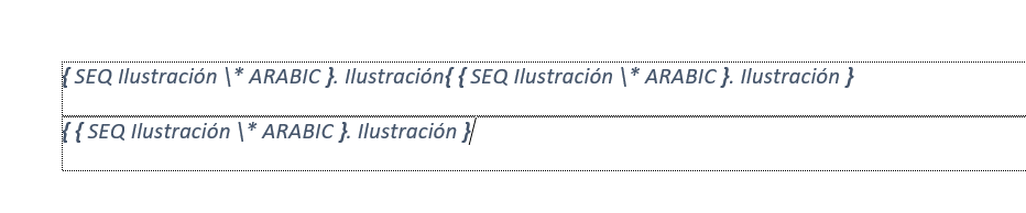 Comprueba que estés insertando la imagen En línea con el texto y mira si persiste el error. Te debería salir como en mi imagen. Primero el rótulo del título y después, solo una vez, un campo SEQ. Parece como si estuviera insertándolo dos veces.