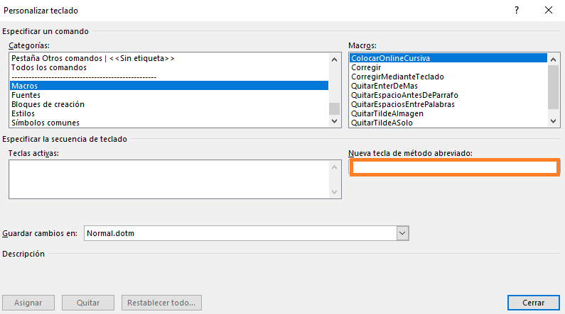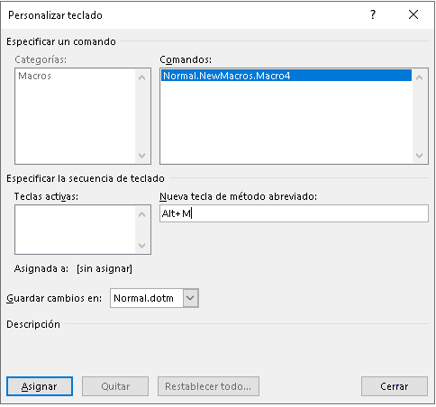 ¿Cómo están? ¿Podrían ayudarme con esto?: tengo dos alumnas que no pueden asignar una combinación de teclas a una macro. Dicen que, cuando posicionan el cursor en el campo Nueva tecla de método abreviado y presionan, por ejemplo, Alt + M, o cualquier otra combinación de teclas, no aparece esta combinación en el campo. ¿Alguna idea de qué puede estar pasando?
