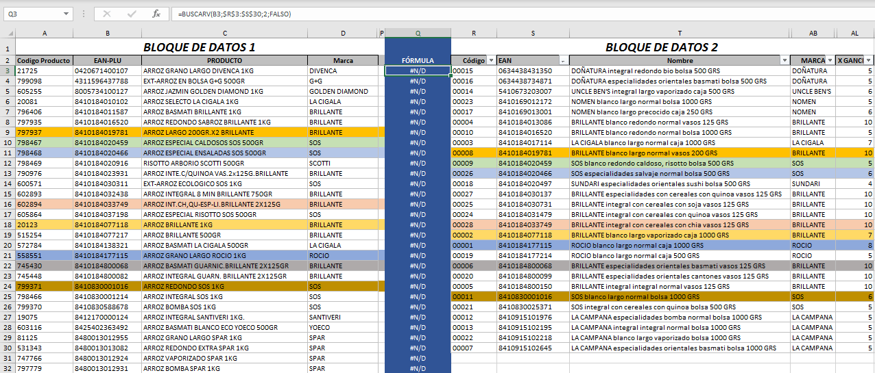 Creo que no estás usando adecuadamente buscarv, Juan Jesús. Buscas el código EAN de B3 en R3:S30. Para que lo encuentre, en la matriz a buscar, debe estar en la primera columna de la izquierda, columna R, y no es así. Lo tienes en la segunda, la S.