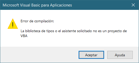 [Microsoft Visual Basic para Aplicaciones] Error de compilación: La biblioteca de tipos o el asistente solicitado no es un proyecto de VBA. El error salta en una llamada a una función que se encuentra en una librería compilada como ejecutable (accde) y referenciada correctamente; de hecho la librería se encuentra en la misma carpeta que la aplicación principal.