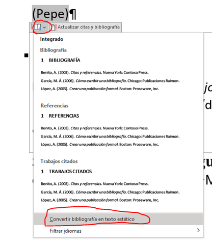 WordExperto 63,900 Puntos de reputación Moderador voluntario2022-12-20T11:17:52+00:00 Despliega la flecha de la cita, y de la bibliografía y Convertir cita, o bibliografía, en texto estático.