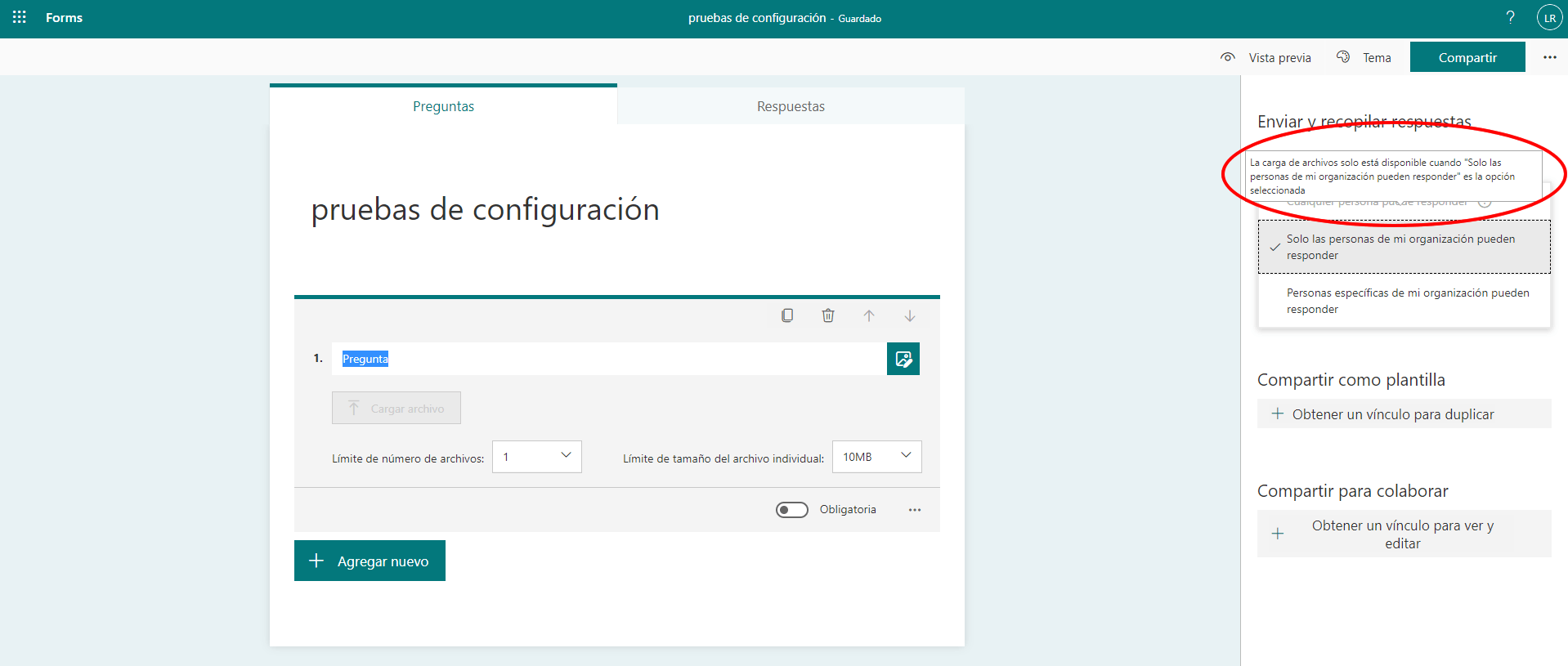 estoy tratando de hacer un formulario que permita cargar un archivo, hasta ahí todo normal, solo que requiero que personas externas a mi organización respondan el cuestionario pero al compartir la opción esta deshabilitada y no permite compartir este formulario. existe alguna forma para habilitar esta opción