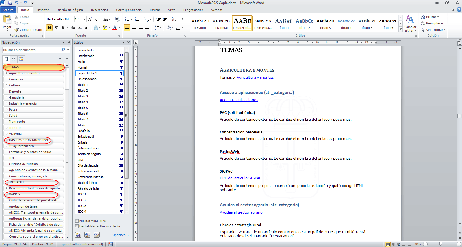 Ahora necesito dividirlo en capítulos (Temas, Información municipal, Intranet y Varios).