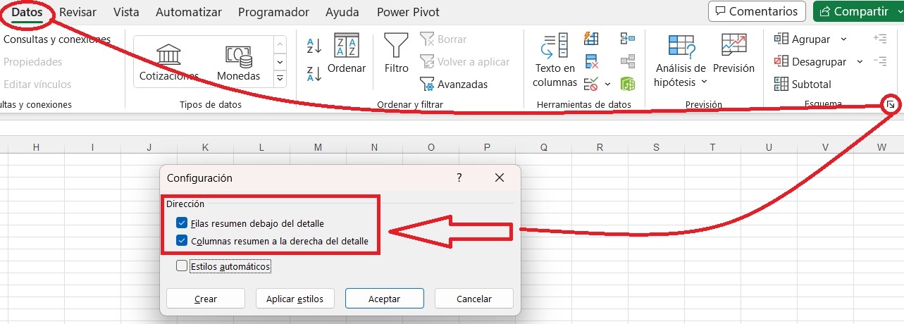 Uso muchas agrupaciones en mis archivos de excel y recientemente me di cuenta que en un archivo el botón para agrupar las columnas está al final de la agrupación, cómo en la imagen adjunta, lo que funciona mucho mejor para mi