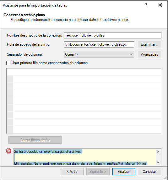 Más detalles:No se pudieron recuperar datos de user_follower_profiles#txt. Motivo: No se puede completar la consulta. El resultado de la consulta tiene un tamaño superior al tamaño máximo de una base de datos (2 GB) o no hay espacio temporal suficiente en el disco para almacenar los resultados.