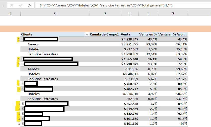 Tengo esta TD, al lado mediante la formula asigno un número 1 solo para los clientes, no para sus productos. ¿Cómo puedo hacer para que en vez de un 1, se genere una cuenta (1, 2, 3...n)
