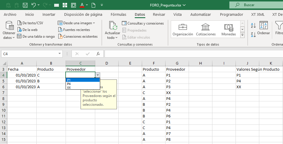 Descripción: En la plantilla se quiere capturar algunas transacciones a nivel de producto, se busca que una ves que el capturista ingrese el producto, en la columna de PROVEEDOR exista una lista desplegable que solo muestre los proveedores que surte este producto.