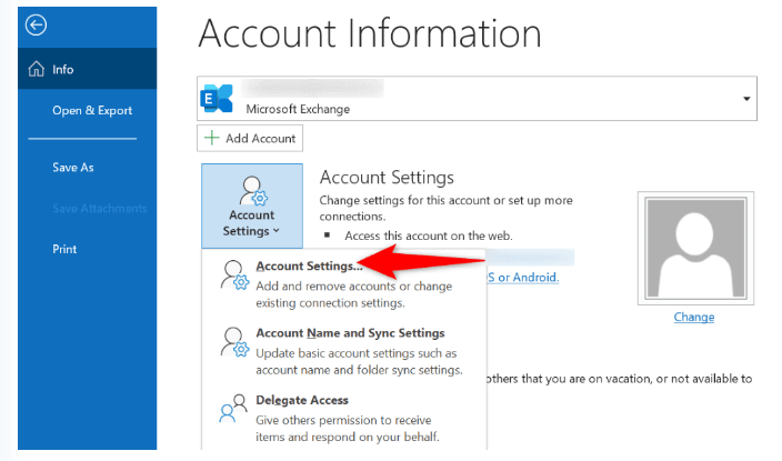 - Abra Outlook y diríjase a Información de > de archivos > Configuración de la cuenta > Configuración de la cuenta.