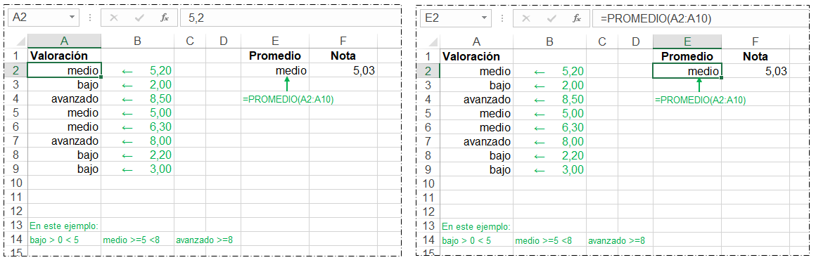 En mi ejemplo se actúa a la inversa: En vez de hallar el promedio de textos, hallo el promedio de números, es decir escribo números, pero ► en vez de ver números que se vean textos (el ejemplo es la imagen de abajo).