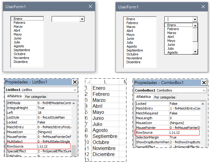 Un formulario VBA (UserForm) no tiene una propiedad RowSource. Supongo que te referirás a un cuadro de lista (ListBox) o a un cuadro combinado (ComboBox) que tienes dentro de un formulario.