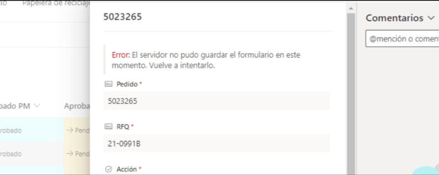 Al guardar un formulario le da error - Sharepoint
